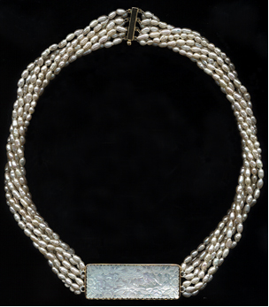 NOTE: The 8 Row Necklace style can be worn 6 different ways: untwisted, tightly or softly twisted and ditto for the reverse side of the Carved Pearl--both sides are different.