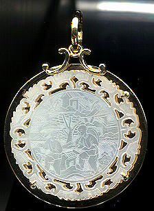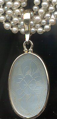 Hand Made ~ FINE QUALITY ANTIQUE CHINESE MOTHER~of~PEARLActual Finished Size: Neck only: 18 Inches (Can be shortened) Drop Section: From Base of Mother of Pearl to Bottom Pearl: 2-1/2 Inches (Can be shortened) Engraved Mother of Pearl: 28 mm.. x 23 mm.. or, Inches 1-1/8 x 15/16". NOTE: The