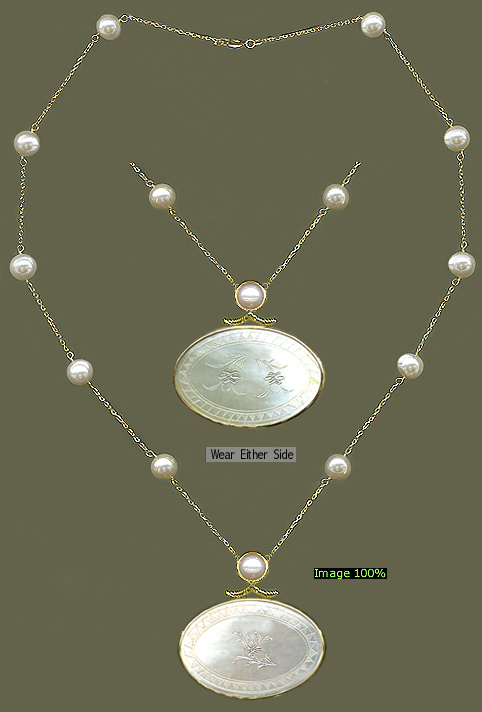 Hand Made ~ FINE QUALITY ANTIQUE CHINESE MOTHER~of~PEARLActual Finished Size: Neck only: 18 Inches (Can be shortened) Drop Section: From Base of Mother of Pearl to Bottom Pearl: 2-1/2 Inches (Can be shortened) Engraved Mother of Pearl: 28 mm.. x 23 mm.. or, Inches 1-1/8 x 15/16". NOTE: The