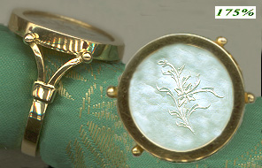 Filigree-Fret-Worked IS AVAILABLE-- COUNTER ONLY $295.00 NOTE: SCAN DOES DO COUNTER JUSTICE DUE TO THE SHINE BURNING THE IMAGE Not Available on Ebay Yet - To Buy Contact For Custom Design:Telephone: 1 (510) 479-4792 Or, Email: Info@MotheroPearl.com Larger Image of Below Design http://www.motheropearl.com/SwivelFretArmBird_150.jpg ![]() .HAVE THIS DESIGNED I4K HEIRLOOM JEWELRY SEE MOCK UP HERE WITH 3 DIAMONDS CLICK: http://www.motheropearl.com/Dia100FretArmorialSceneBird.jpg ![]() |